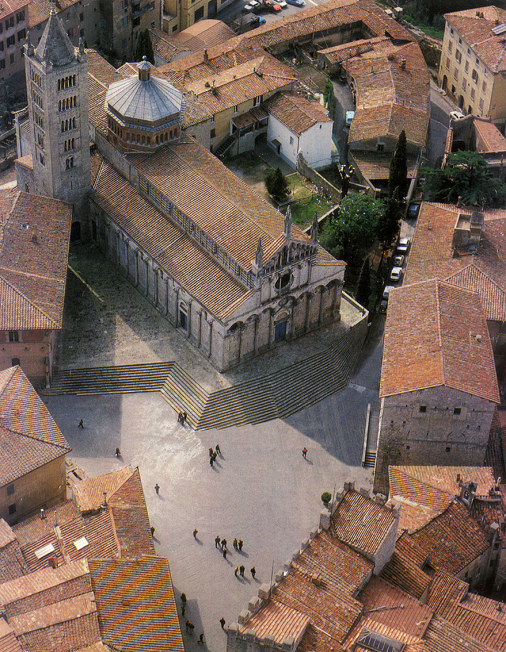 I arrive in Massa Marittima just after sunset, when the travertine of the buildings lights up in ivory and the sky turns cobalt. The square has carefully calculated its balance of power. Here I witness the meeting of the Cathedral, the Palazzo del Podestà, the Clergy house, the town hall, the market Loggia, the Zecca and the surprising Fonte Pubblica, the town’s public water source. Politics, religion and economics, all united and enclosed in a single, beautiful space: this may be why the square’s design is so difficult to describe.