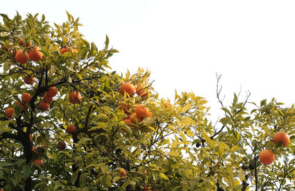 see oranges growing, planted in the ground.