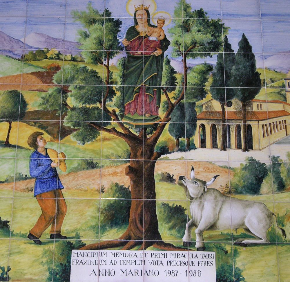 Another century went by, when a cowherd taking his cattle to their pasture noticed a calf unusually breaking away from the herd and turning back. Curious, the cowherd followed it, and found the animal on its knees at the foot of an ash tree. Between its branches, to his utter marvel and incredulity, he noticed the statue of the Madonna.