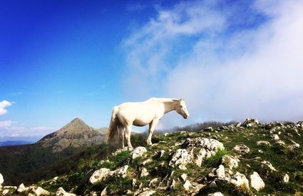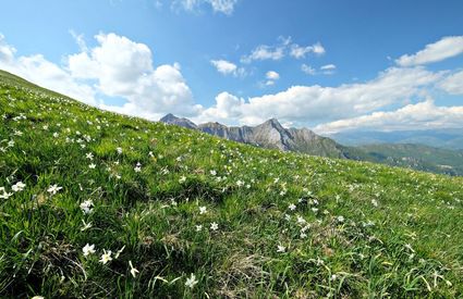 Here I am again, it's still me, the Chough. As it's a beautiful day, come with me to see a mountain I love: Monte Croce. In May its meadows that slip down steeply towards the valley floor are covered in a white, scented blanket: there are hundreds and thousands of daffodils, that wave in the wind. Let's have a day in the countryside! We'll take a blanket and lie on it, breathing in the flowers and letting our gaze: before us stretch peaks and the majestic Pania della Croce, the jewel in the crown.