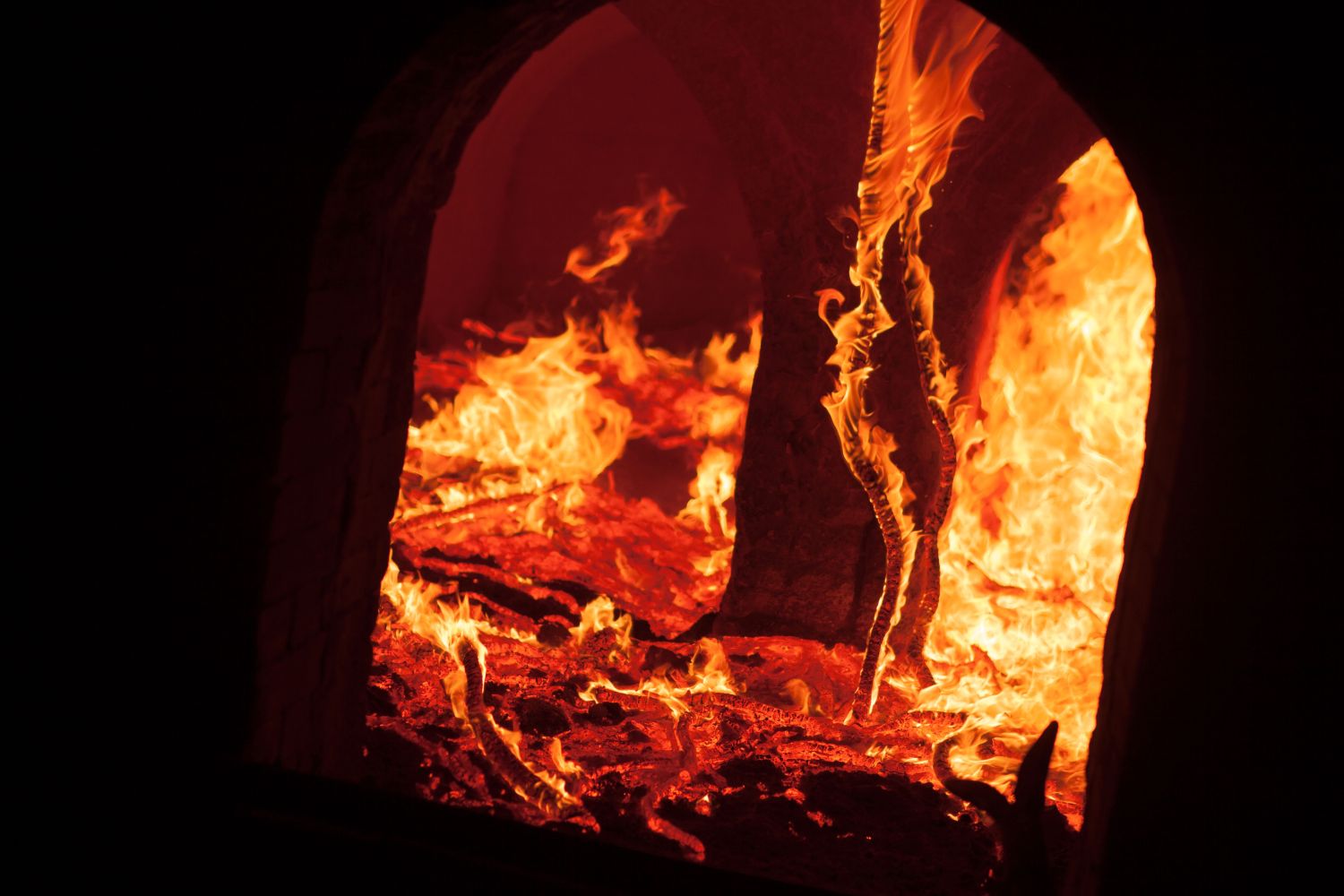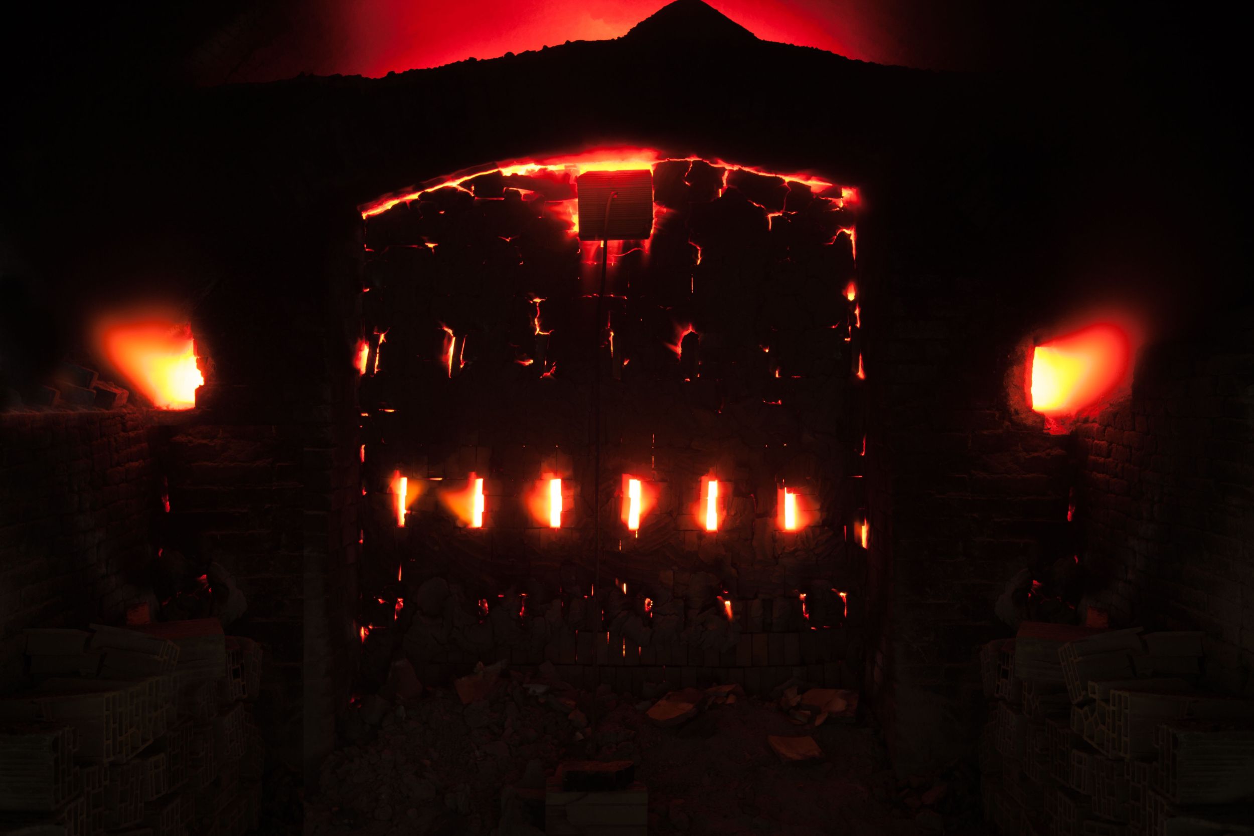Si avvicinarono, e passando sotto un arco di pietra entrarono in un ampio spazio pieno di uomini indaffarati e vestiti in modo strano. I bambini furono attratti da uno spettacolo singolare: in una parete di fronte a loro si apriva una vasta porta interamente ostruita con dei mattoni non murati che apparivano incandescenti, o è meglio dire che dalle fessure sprizzava una infuocata luce infernale e un immenso calore.