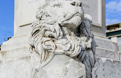 Nel 1853 fu portato e collocato al centro della piazza. Ma lo "stelo" marmoreo si perdeva nel vasto spazio dalla cinta arborea, e il professor Giovanni Isola, grande ornatista vincitore all’Esposizione Universale di Parigi, propose allora di allocarne alla base quattro fieri leoni, da scolpirsi presso la locale scuola di scultura, in blocchi di marmo di palmi 190.